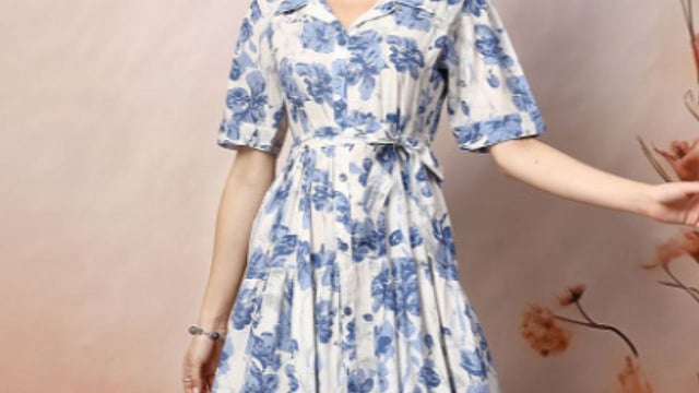 The dress features blue floral prints on a white base.