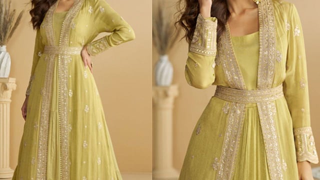 Elegant and festive, this one has a more classic feel to it. The olive and gold combination looks rich without being too heavy, and the embroidery adds a traditional touch. It’s a good option for occasions where you want something simple but elegant.