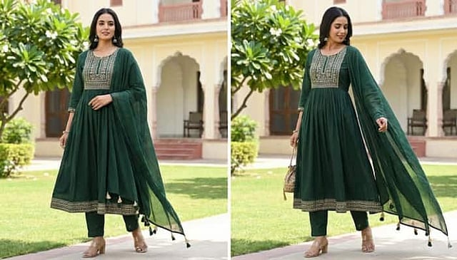 This anarkali set brings a flowy silhouette that flatters the figure while keeping the look perfect for Mehendi events. It offers a blend of comfort and subtle embroidery that enhances the outfit’s elegance. Consider this piece if you prefer traditional charm with simple finishing.