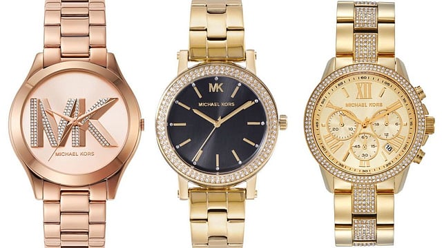 A mini rectangular gold-toned dial with embellishment and a gold-toned bracelet strap; this one focuses on a sleek silhouette rather than extra complications, and the MK site lists it as a 21mm case with water resistance up to 5 ATM.