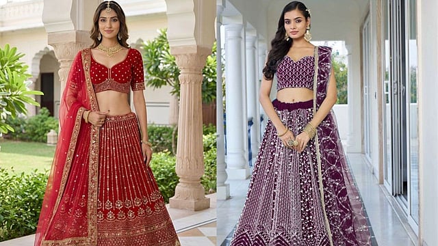 This story brings together velvet lehenga options curated with an eye on what shoppers usually care about: how heavy the outfit will feel, whether the colour reads deep (not flat) on velvet, and how easily the set can be reworn with a different blouse or dupatta. Velvet is often recommended for winter and evening wedding functions because its plush texture and sheen create a regal look.
