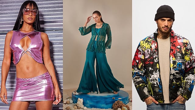 This is the outfit you choose when you want all eyes on you, no questions asked. This pink metallic co-ord set is pure, unfiltered glamour designed for a big night out. You get a round neck crop top that features a playful tie-up closure at the back, paired with a matching metallic mini skirt that has a simple slip-on design. It is a complete head-turning look, perfect for a music festival or a party where you are the center of attention.
