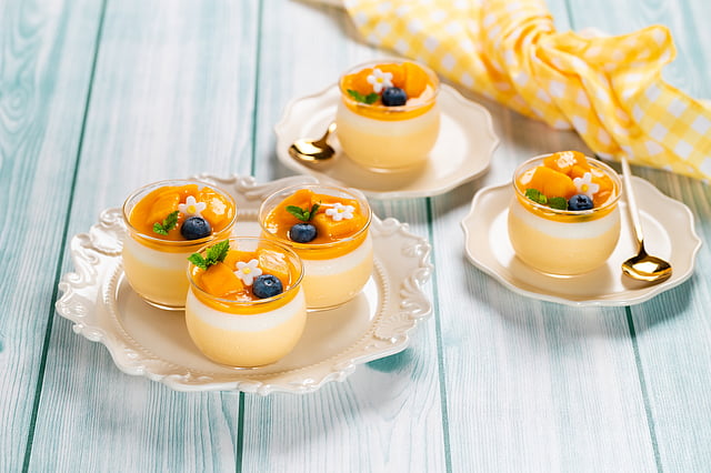 Alphonso and Kesar mangoes are preferred for mango mousse due to their sweetness and aroma. These varieties provide the best flavour and natural colour, making your mousse delicious and visually appealing.