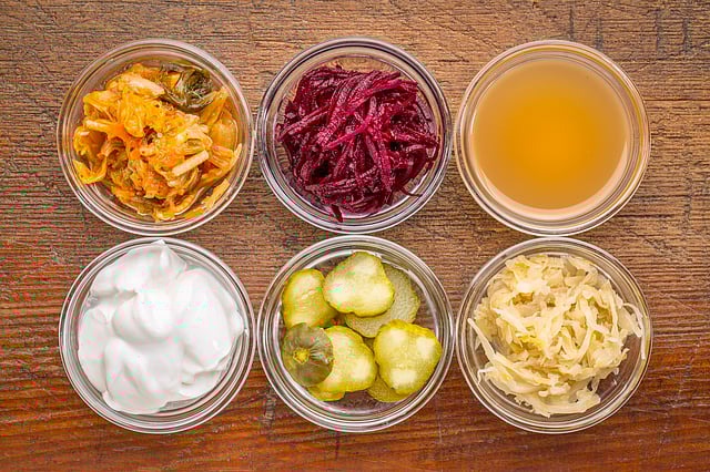 Fermented foods such as yogurt, kefir, kimchi, sauerkraut, miso, and tempeh.