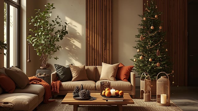 Think of your living room as a chic winter editorial spread. Warm beige throws, olive green cushions, rust toned pottery and cane baskets create a palette that feels elevated and effortlessly festive. Natural fabrics like linen and cotton bring softness while wooden trays and ceramics add grounding beauty.
